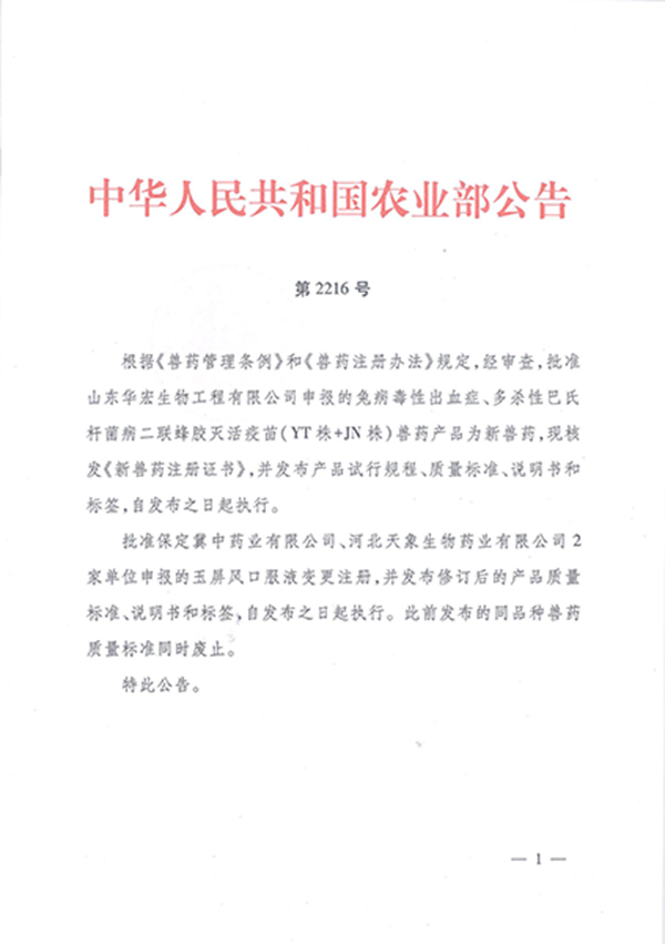 近 日,华宏生物生产的兔病毒性出血症、多杀性巴氏杆菌二联蜂胶灭活疫苗(YT株+JN株),通过了农业部的审查并获得了兽药产品批准文号(兽药生字(2016)150106034),有效期从2016年1月25日至2021年1月24日,符合《兽药管理条例》、《兽药产品批准文号管理办法》等有关规定,已具备生产条件,即可销售。