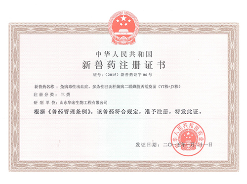 该产品是我国首个新型绿色兔用蜂胶灭活疫苗产品,由华宏生物自主研发,并于2015年1月21日顺利取得农业部核发的三类新兽药证书。采用免疫原型良好的兔病毒性出血症病毒YT株和A型兔多杀性巴氏杆菌JN株,通过生物培养、灭活,配置以优质蜂胶佐剂制成的新型绿色环保型疫苗,是 一种安全、高效的疫苗新产品,用于预防兔病毒性出血症、多杀性巴氏杆菌病;免疫效果达到90%以上(目前国内现行标准75%),质量标准达到我国目前同类 产品的最高水平。