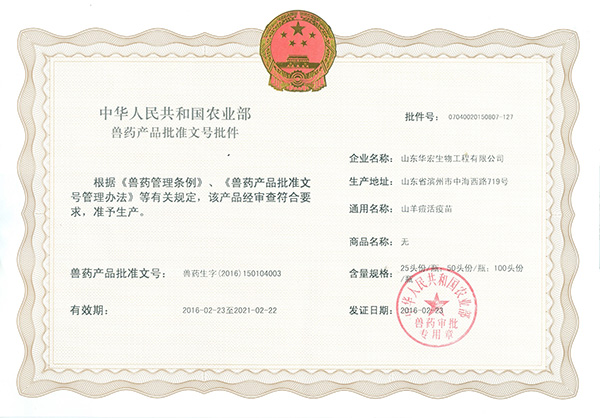 华宏生物研发生产的“山羊痘活疫苗”通过了中国兽医药品监察所的质量复核检验,获得了农业部核发的兽药产品批准文号(兽药生字(2016)150104003),有效期从2016年2月23日至2021年2月22日,已具备生产条件,即可销售。